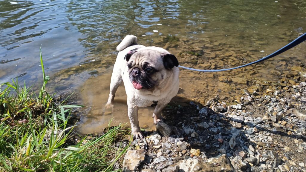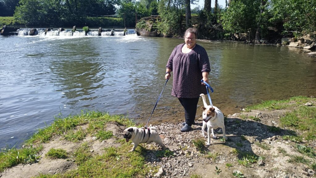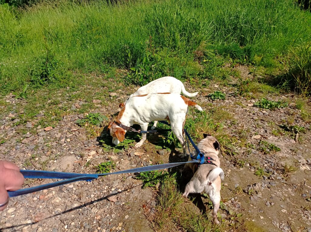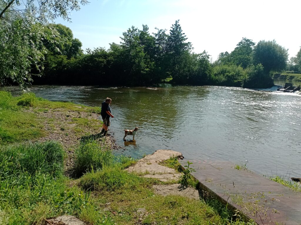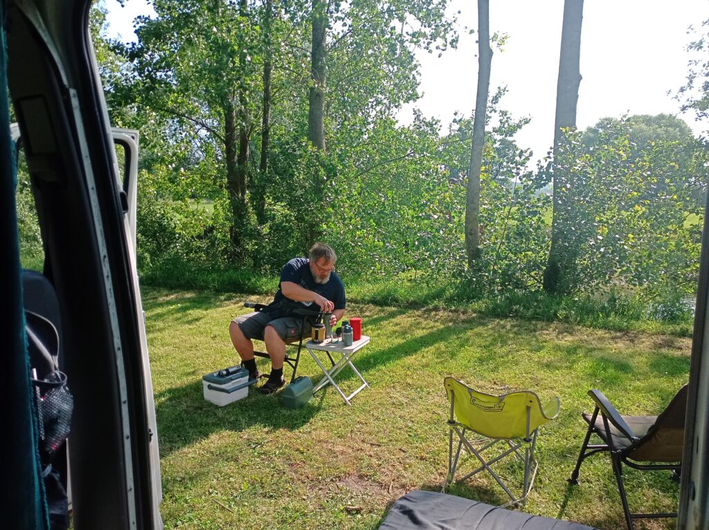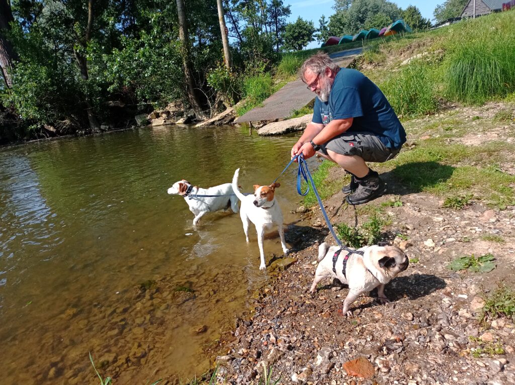 We worden wakker en voelen dat het een warme dag wordt. Eerst koffie en dan lekker de honden laten poedelen in het riviertje.