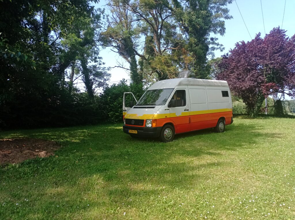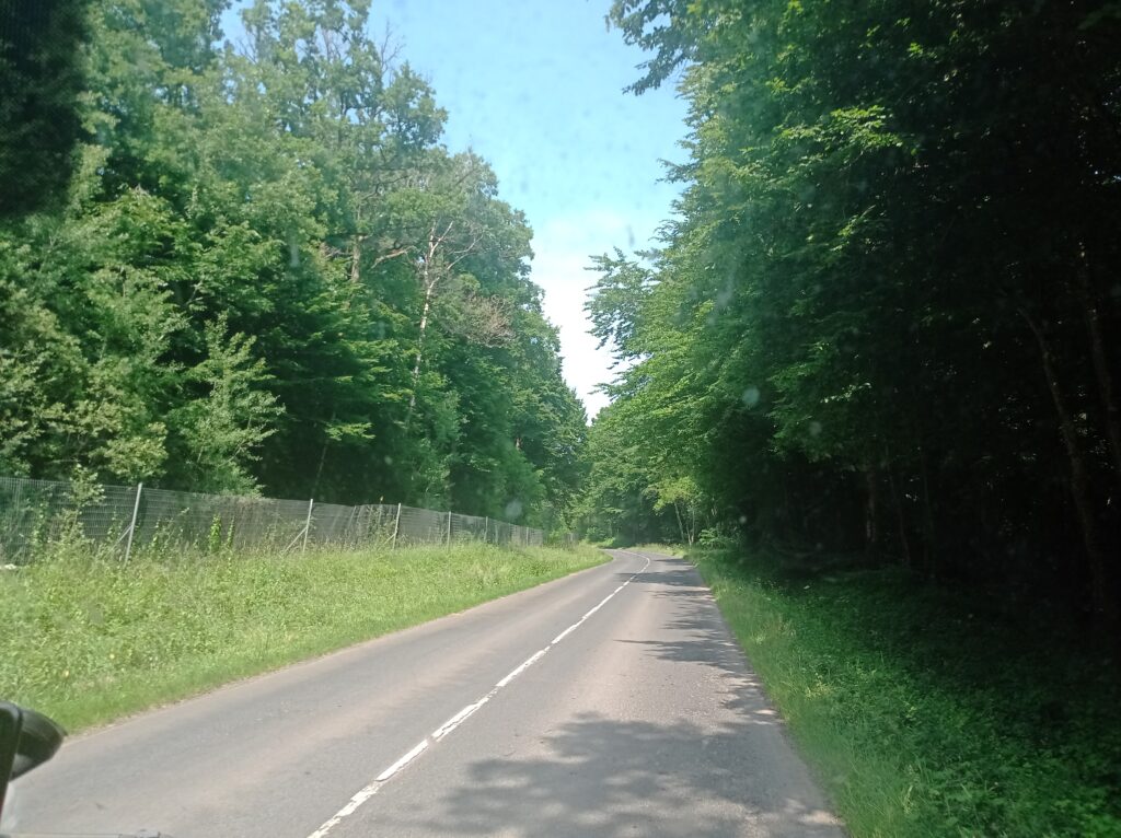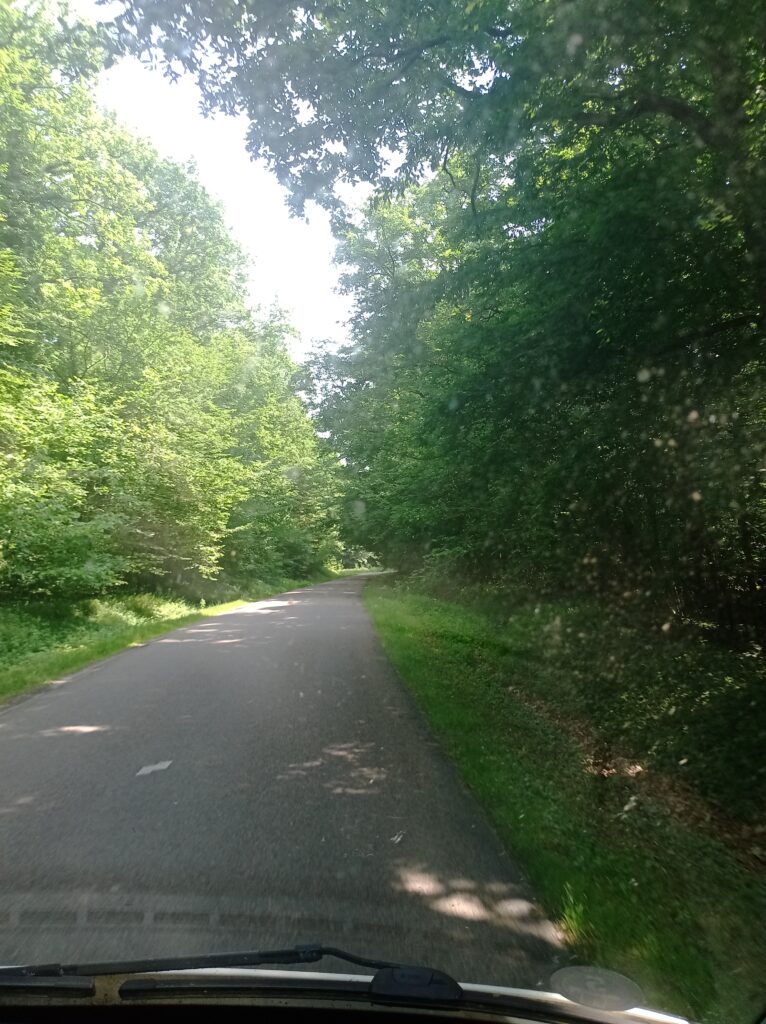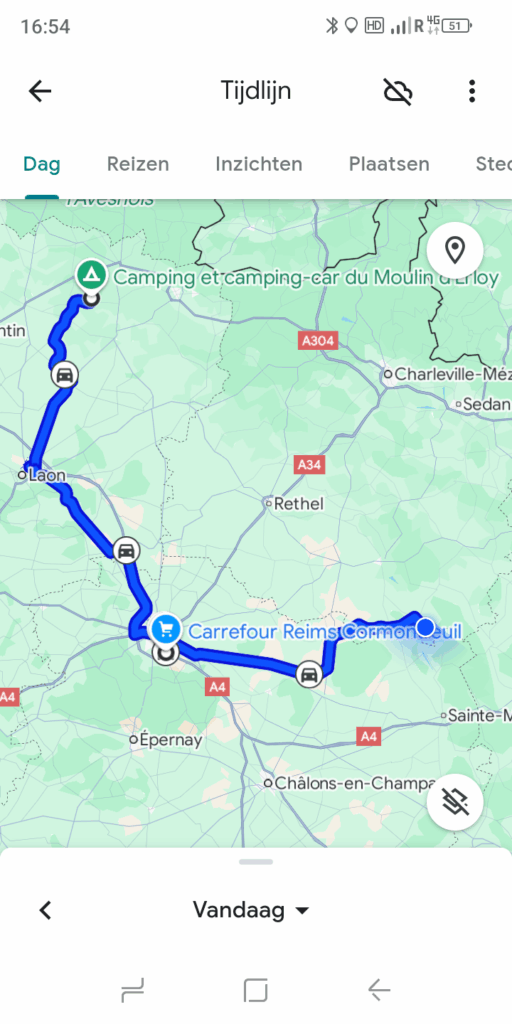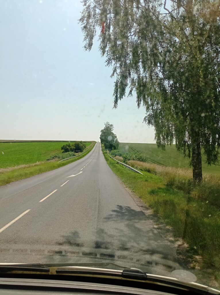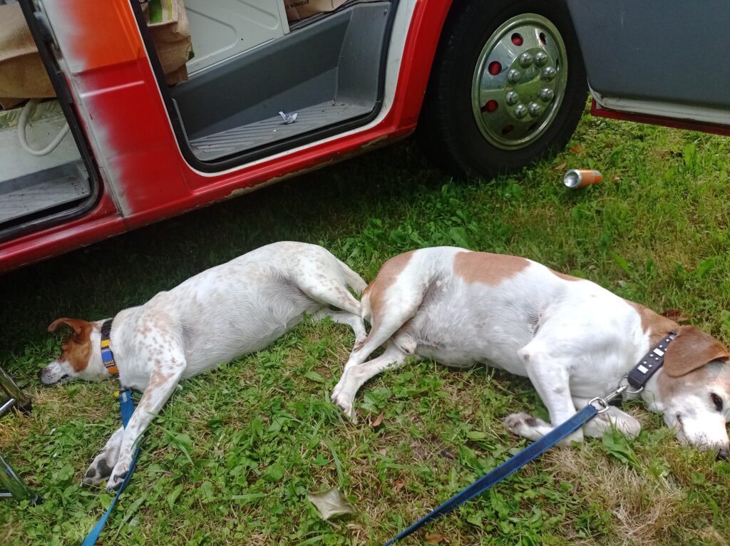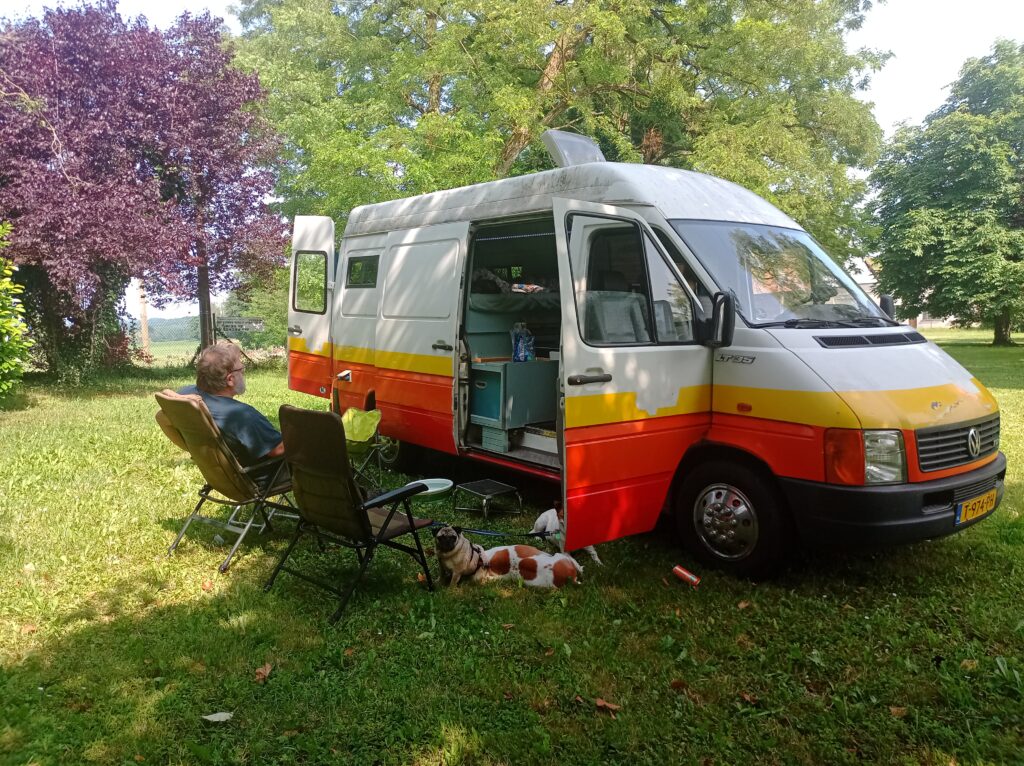 In Reims willen we even snuffelen bij de Decathlon maar er staat een poort die niet hoog genoeg is. Er staat wel een icoontje bij van een intercom met een pijl omhoog. We bellen, zeggen in het beste Frans dat we met de Camper zijn en jawel hoor… Op afstand wordt de poort omhoog gedaan zodat we er onderdoor passen en kunnen parkeren. Het is mij een raadsel waarom je langer dan nodig op zo’n parkeerplaats zou willen blijven.. maar het gevaarte zal er vast niet voor niks staan. Het is flink warm dus Rein gaat snel de noodzakelijke dingen halen en Inez blijft bij de honden. Kino en Tessy doen het prima met warmte maar Bram is flink overstuur. Hij ademt heel moeilijk met de warmte en gaat een soort hyperventileren. Een lekker badje in de afwasteil en zeiknat voorin tussen ons in en hij wordt gelukkig weer rustiger.